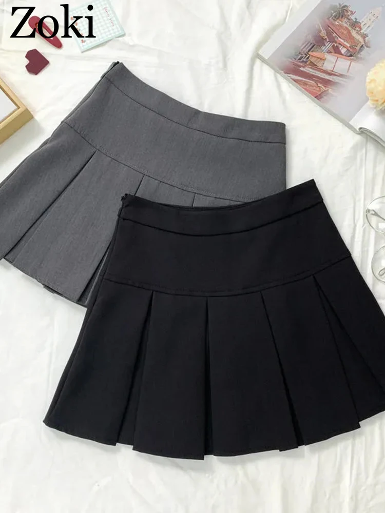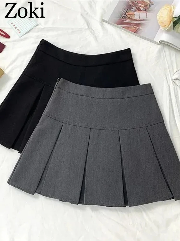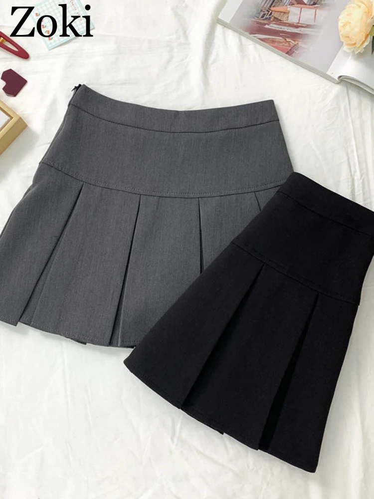 ZOKI Vintage Gray Pleated Skirt Women Kawaii